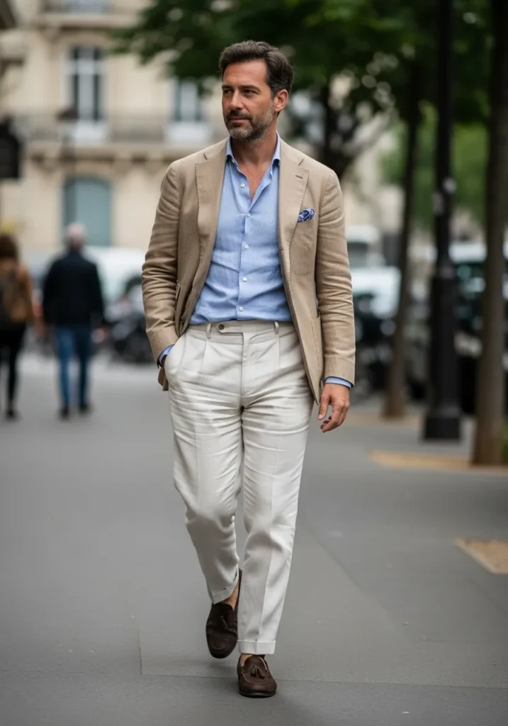 This outfit combines a light brown linen blazer with a pale blue shirt and white linen trousers. The blazer brings warmth while the white pants keep the look fresh and airy. Brown loafers tie everything together in a relaxed and cohesive way. It feels very Mediterranean and summery.