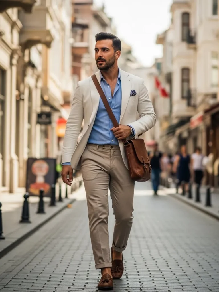 This outfit features a light blue linen suit paired with a crisp white shirt worn open at the collar, finished with brown leather loafers. The fabric looks airy with a relaxed drape, and the tailored cut keeps everything semi formal without feeling stiff. The overall vibe feels very European and effortless, like something you would spot outside a small city café on a warm afternoon.