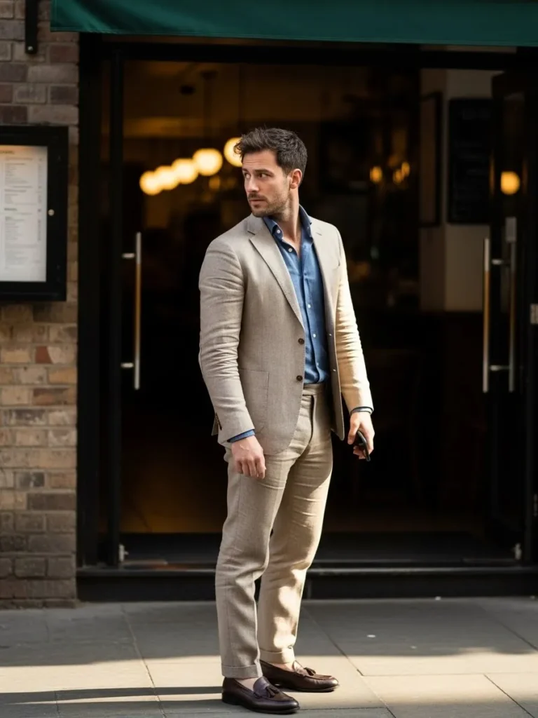 This look shows a beige linen suit styled with a light blue shirt and a relaxed layering effect that feels very natural. The trousers sit neatly with visible fabric folds, and the brown shoes add warmth to the outfit. Everything feels tailored but easy.