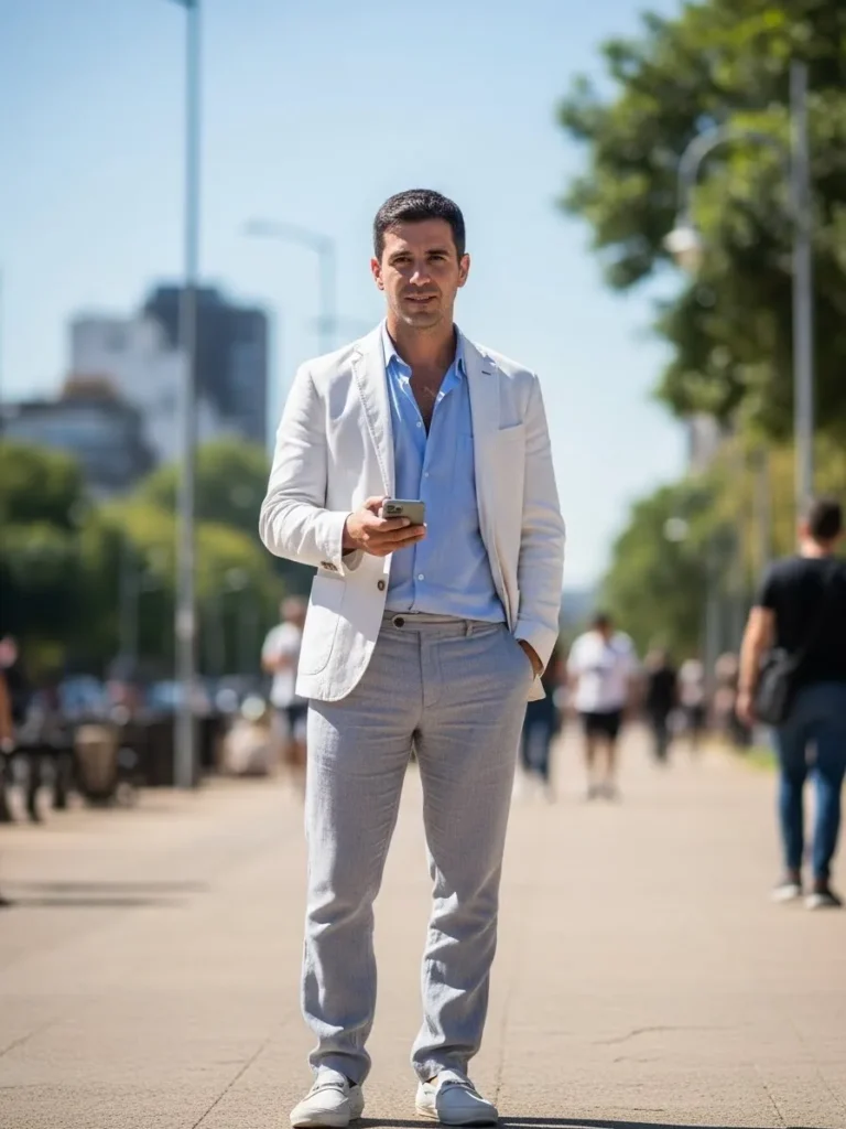 This outfit combines a white linen blazer with a light blue shirt and light gray trousers. The linen texture adds softness, while the clean colors keep everything fresh and summery. The overall feel is bright, relaxed, and modern.