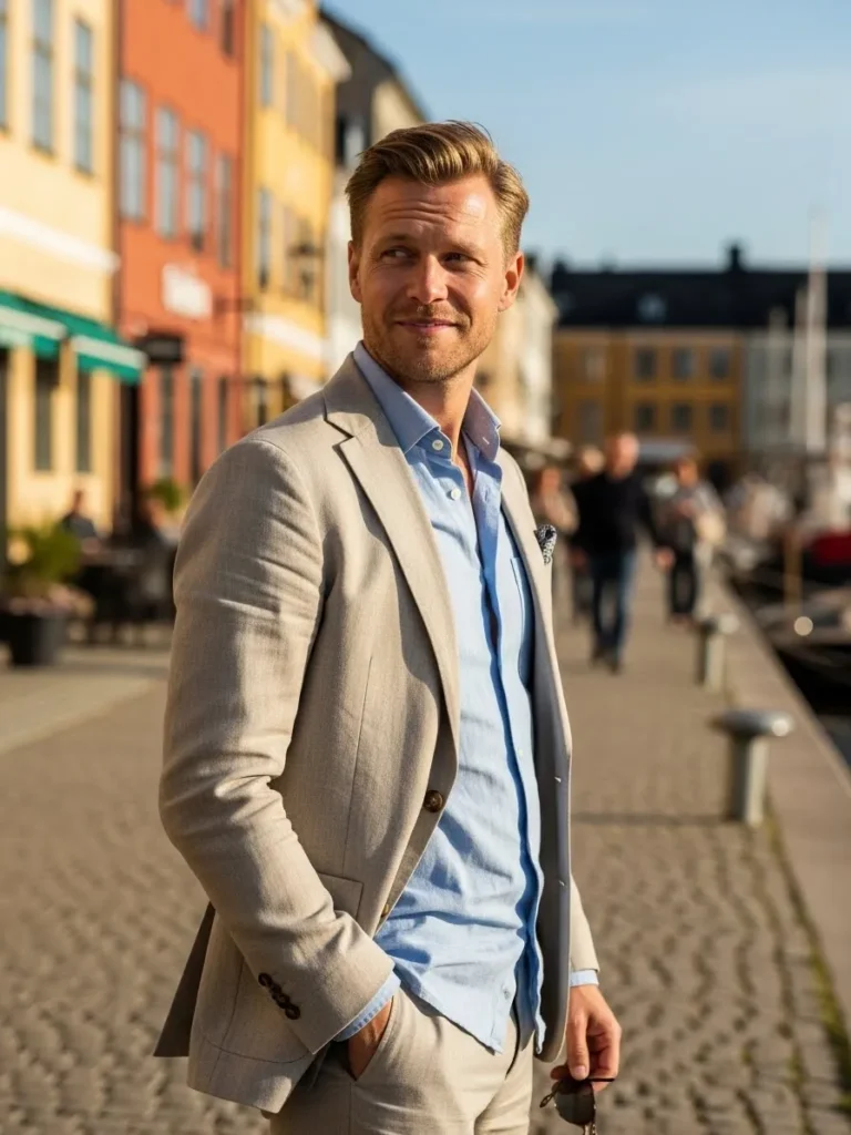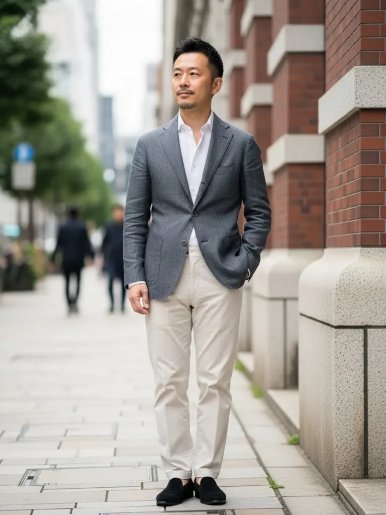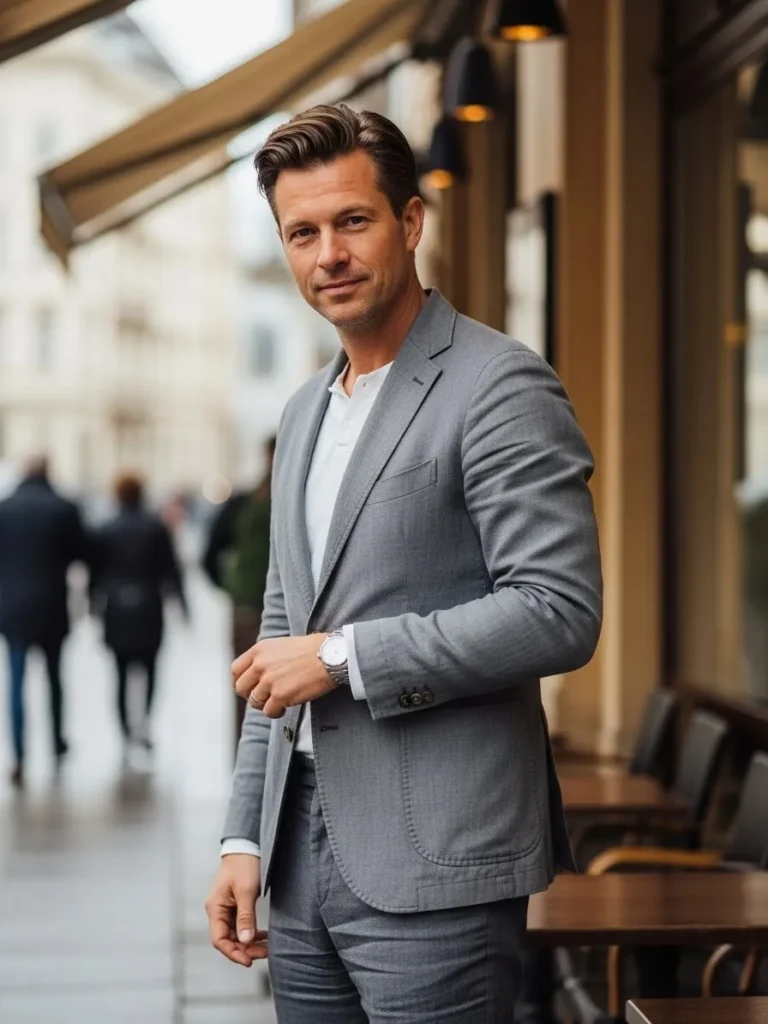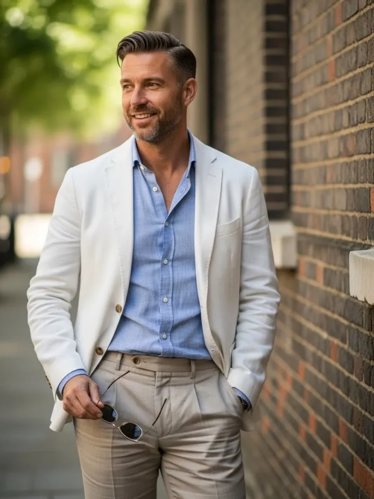 I really like how gray linen feels calmer than darker suits. It looks polished yet approachable, which makes it perfect for warm days. This outfit feels like a safe choice that still looks stylish and modern.