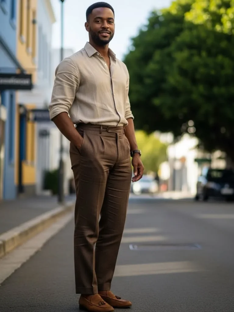 This outfit pairs a beige linen shirt with brown tailored trousers and classic loafers. The sleeves are casually rolled, and the linen fabric shows natural wrinkles that add texture. The vibe feels relaxed, warm, and masculine.