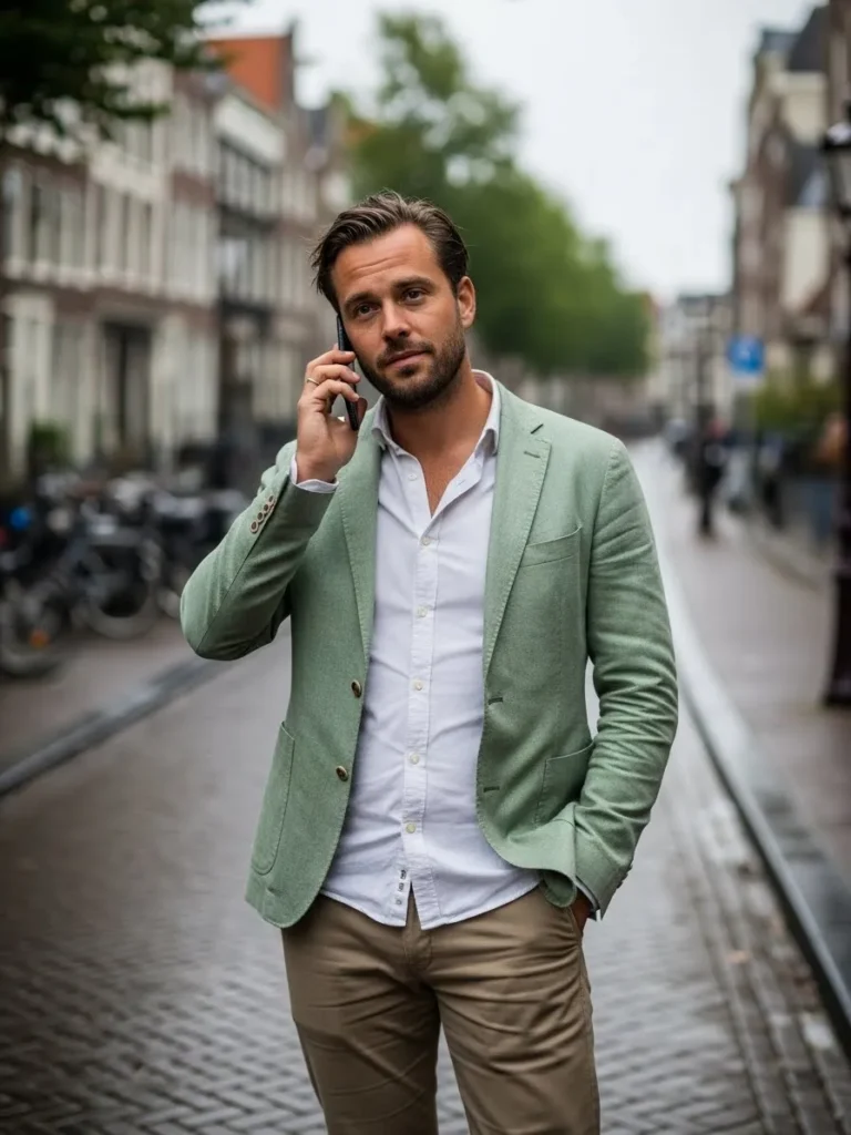This look pairs a muted green linen blazer with a white shirt and beige trousers. The linen texture softens the green, making it feel wearable and elegant. The overall style feels modern with a relaxed edge.