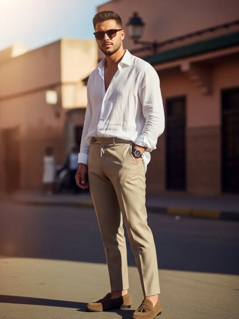 This outfit features a crisp white linen shirt worn open at the collar, paired with light beige tailored trousers and brown suede loafers. The linen shirt has a soft, breathable texture with natural wrinkles that keep the look relaxed, while the trousers add just enough structure to stay semi formal. The overall vibe feels clean, confident, and perfect for warm city days.