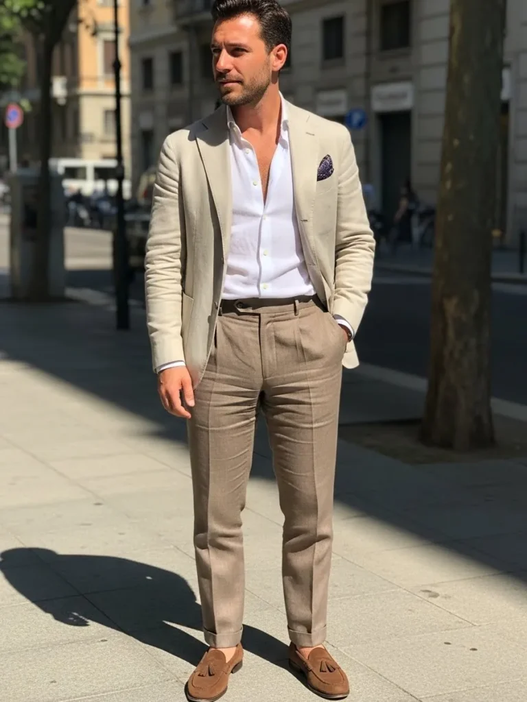 This look combines a light beige linen blazer with a white shirt and matching tailored trousers, finished with brown loafers. The linen fabric drapes softly, showing natural folds that add movement and ease. The color palette feels warm and polished, giving the outfit a refined but breathable feel.