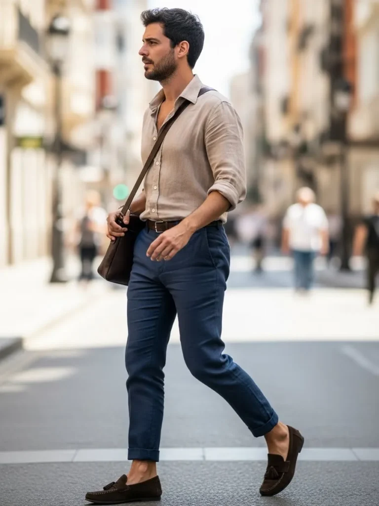 Here we see a lightweight beige linen shirt worn casually with dark navy tailored trousers and brown loafers. The sleeves are slightly rolled, and the shirt has natural wrinkles that give it a lived in feel. It feels clean, masculine, and breathable while still staying in that semi formal sweet spot.