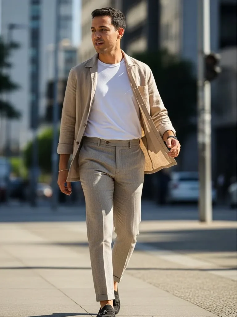 This look features a gray linen suit styled with a simple white shirt and dark loafers. The suit has natural creases that give it character, while the tailored fit keeps it looking sharp. It feels refined but not overly formal.