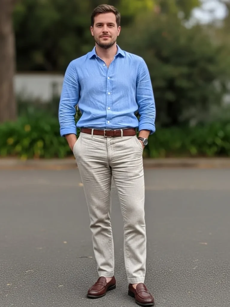 This outfit features a light blue button up shirt tucked into beige linen trousers, finished with brown leather shoes. The colors feel fresh and classic, and the linen trousers show natural wrinkles that make the look feel real and wearable.