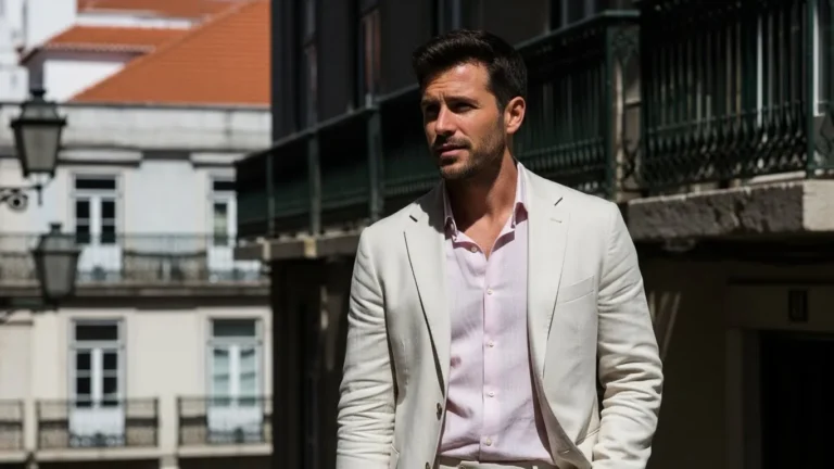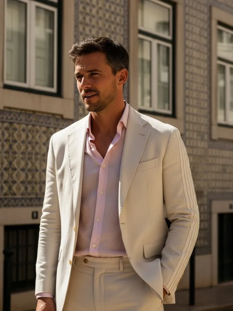 This look pairs a cream linen suit with a soft pink shirt worn open at the collar. The light colors reflect warmth beautifully, and the linen fabric keeps everything breathable and relaxed. The overall vibe feels elegant but very summery.