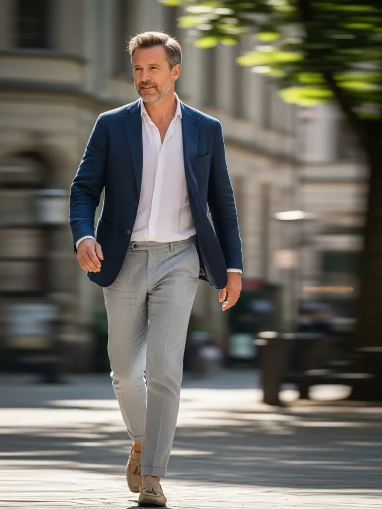 This outfit features a navy linen blazer layered over a crisp white shirt, paired with light gray tailored trousers and brown leather loafers. The linen fabric looks soft and breathable, with subtle texture that keeps the outfit relaxed. The overall vibe feels clean, confident, and perfect for warm city days.