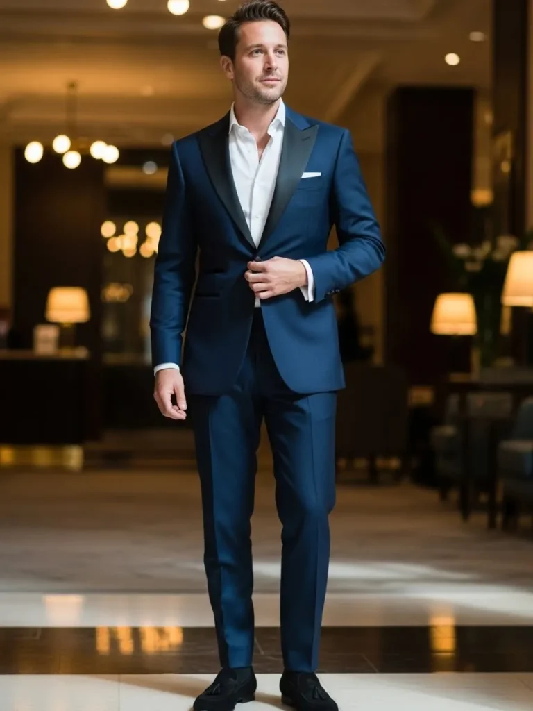 This outfit showcases a deep navy tuxedo styled with a white shirt and dark formal shoes. The fit is sleek and modern, and the rich navy tone looks especially striking under evening lights. The overall styling feels smooth, confident, and perfectly suited for upscale nighttime events.