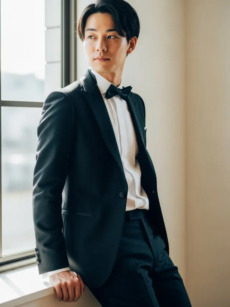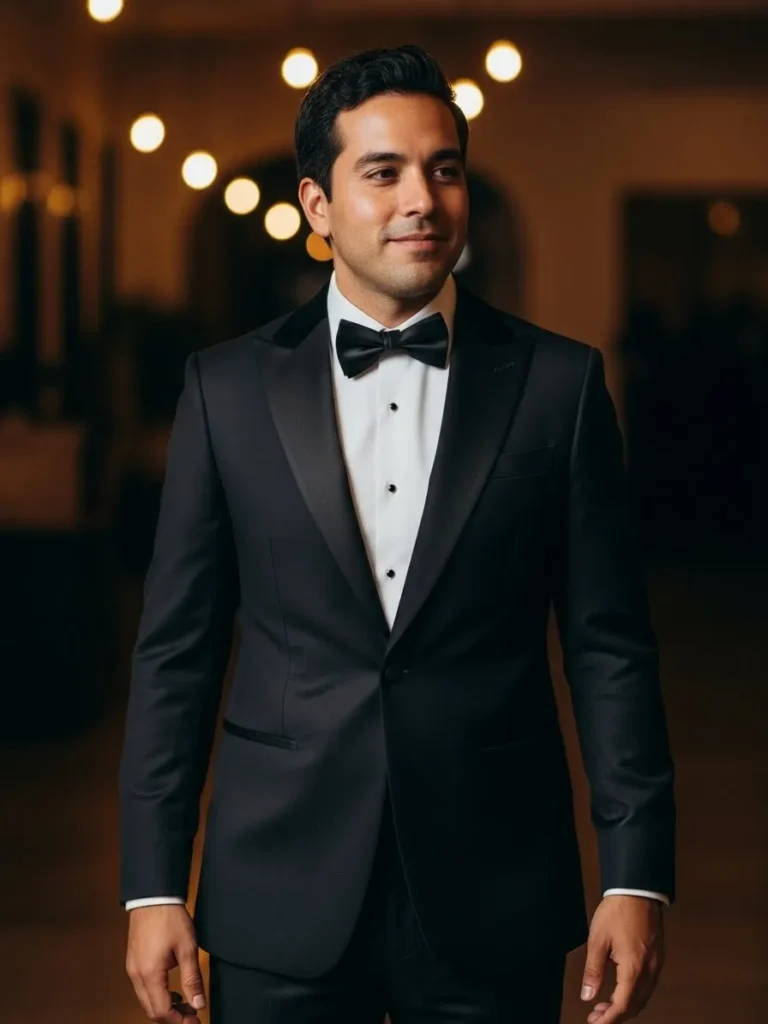 This look features a well tailored black tuxedo paired with a white dress shirt and a classic black bow tie. The fabric falls smoothly, creating clean lines and a polished silhouette. The soft lighting adds warmth and highlights the timeless elegance of the outfit.