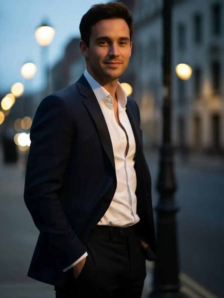 This outfit pairs a navy tuxedo with a white shirt worn slightly open at the collar and dark trousers. The tailoring keeps it refined, while the relaxed styling gives it a modern and approachable feel. The look feels polished but not overly formal.