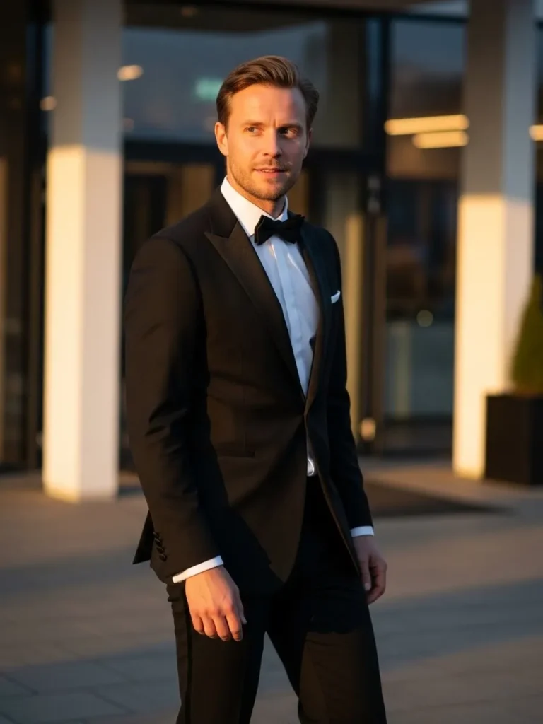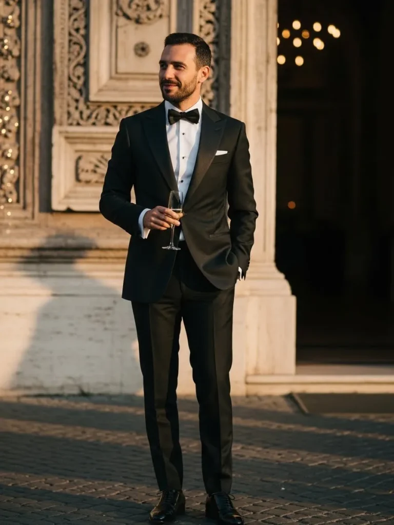This look showcases a sleek black tuxedo with a white shirt and black bow tie, styled against an elegant architectural setting. The tailoring is sharp, and the overall silhouette feels strong and refined. Everything about this outfit reads classic luxury.