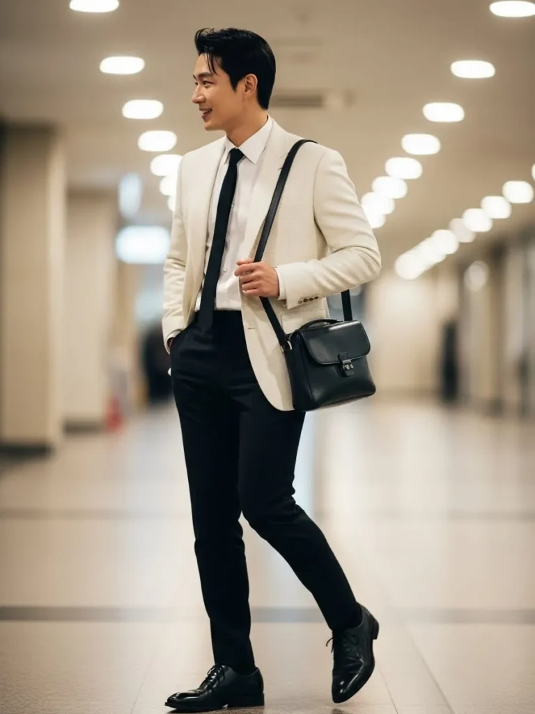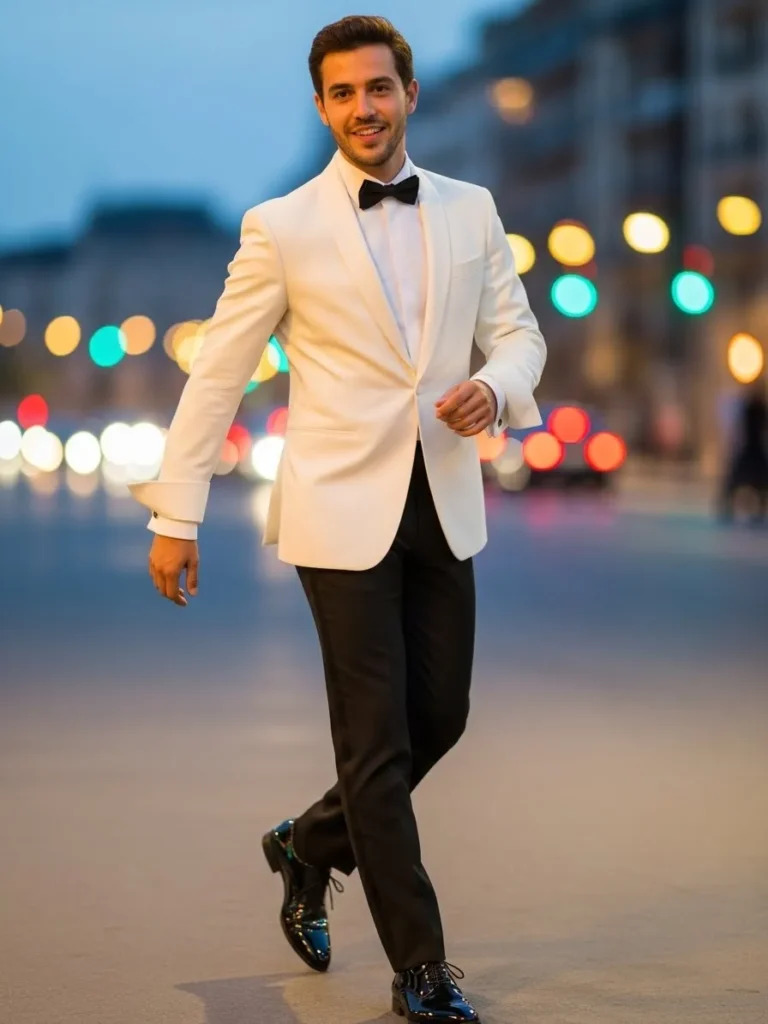 This outfit centers around a white or ivory dinner jacket paired with classic black trousers and a black bow tie. The contrast feels elegant and intentional, and the clean lines keep everything looking sharp. The look is styled with polished black shoes and a confident walk that gives it a red carpet vibe without feeling overdone.