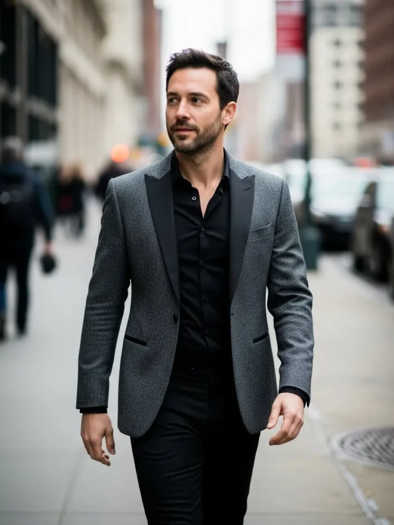I really like how this look balances formal and relaxed elements. The open collar makes it feel confident and easy, while the tuxedo keeps everything refined. It feels like the perfect choice for a stylish evening event with a modern dress code.