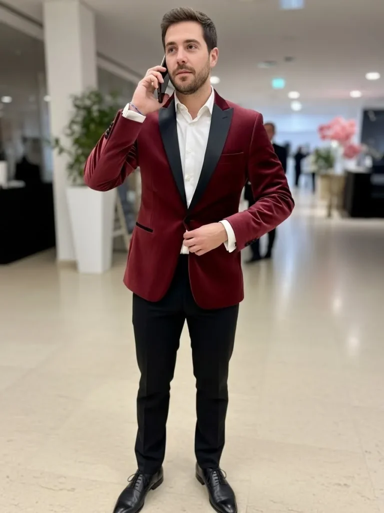 This look features a rich burgundy velvet tuxedo jacket paired with black trousers and black dress shoes. The velvet texture adds instant luxury, while the clean tailoring keeps it refined. The color is deep and warm, making the entire outfit feel dramatic yet polished.