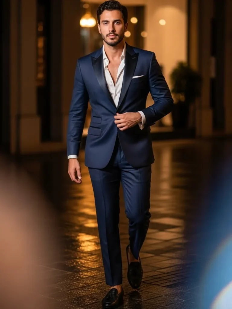 This outfit features a midnight blue tuxedo worn with a white shirt slightly open at the collar and finished with sleek loafers. The deep blue tone feels rich, and the relaxed styling makes it feel modern and approachable. The fabric moves naturally, showing soft folds that keep it from looking too rigid.