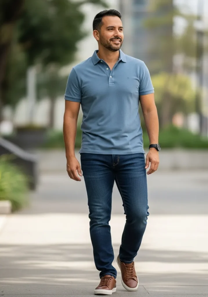 A soft blue polo shirt paired with dark jeans and brown shoes creates a polished yet relaxed casual outfit. The fit feels clean and comfortable without feeling stiff.