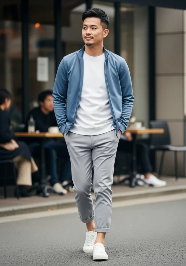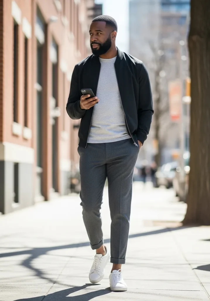This outfit features a dark zip jacket layered over a white T shirt, paired with tailored gray trousers and clean white sneakers. The streamlined silhouette and neutral palette give it a modern city ready feel that looks relaxed but intentional.