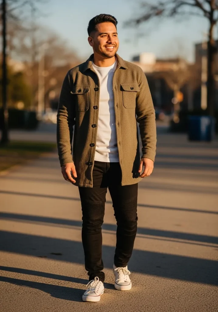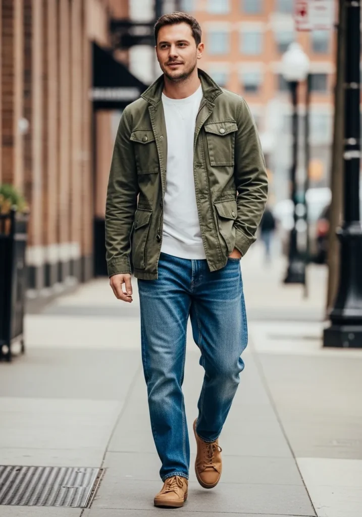 This look combines an olive utility jacket with a light T shirt, black jeans, and neutral sneakers. The earthy tones and structured jacket give the outfit a casual but masculine edge.