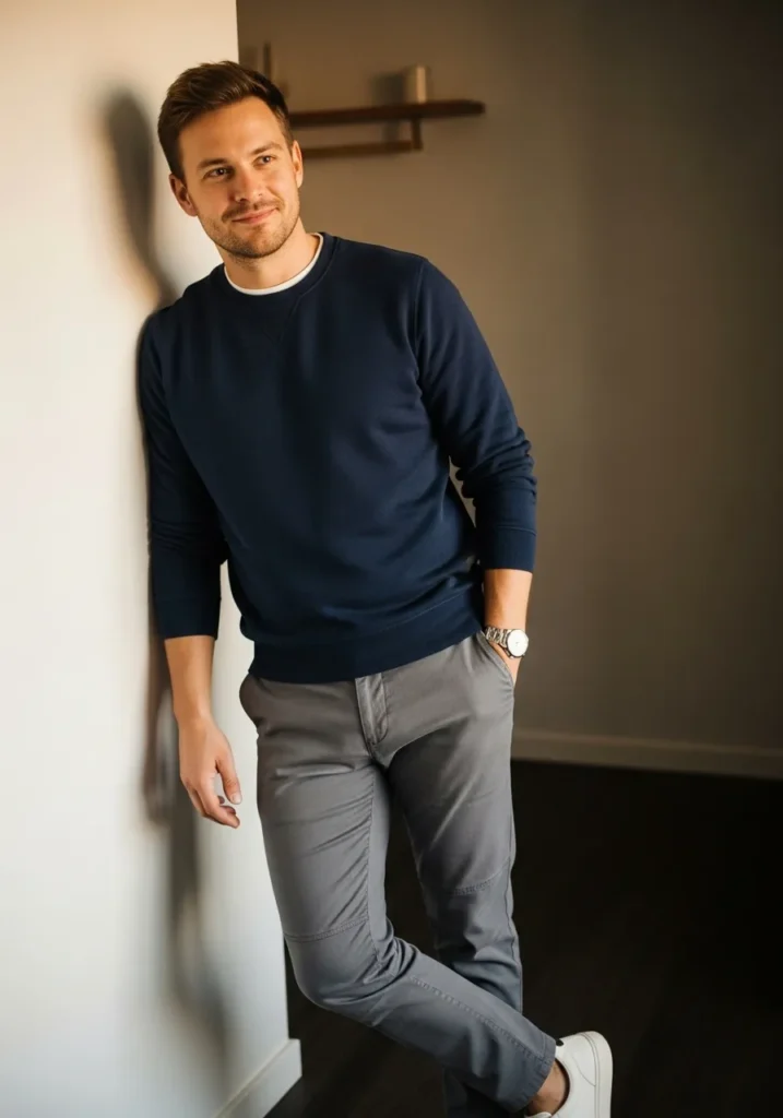 This look keeps things simple with a navy long sleeve top, gray trousers, and casual shoes. The soft colors and clean fit make it perfect for a relaxed indoor setting.