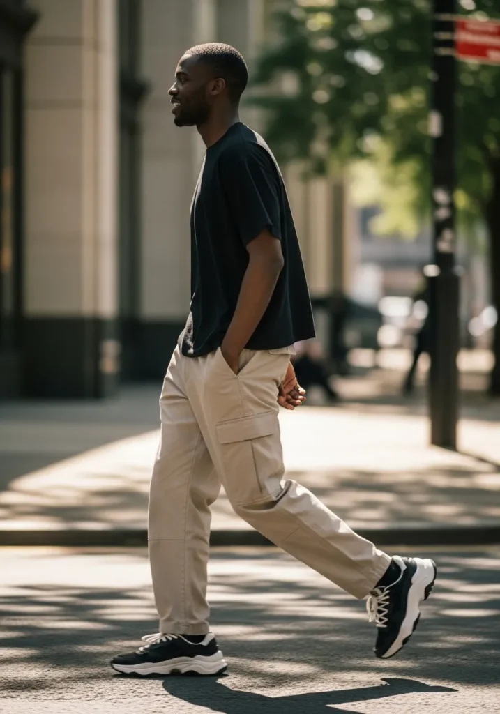 This outfit pairs a black T shirt with beige trousers and sporty sneakers. The contrast between the dark top and light pants gives it a clean and modern streetwear vibe.