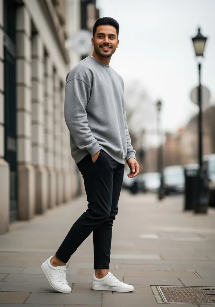 Here we have a light gray sweatshirt styled with tapered black pants and white sneakers. The relaxed top balances nicely with the cleaner lines of the pants, giving the outfit a fresh and modern feel.