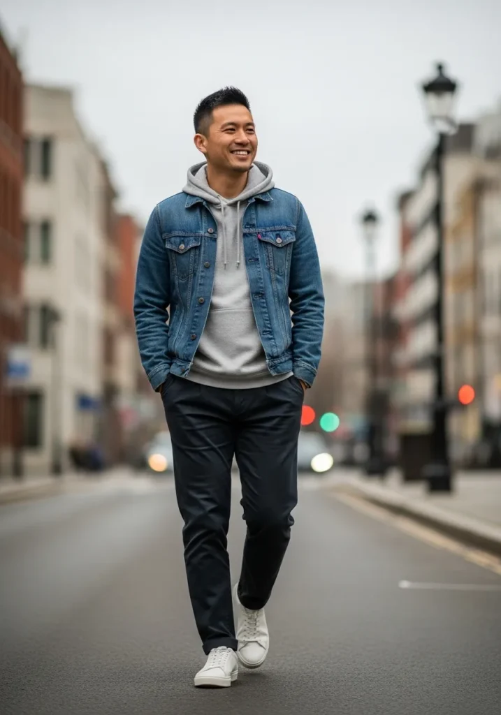 This outfit layers a classic blue denim jacket over a soft gray hoodie, paired with dark tapered trousers and clean white sneakers. The mix of structured denim and cozy casual pieces creates a relaxed city ready look that feels modern, comfortable, and effortlessly cool.