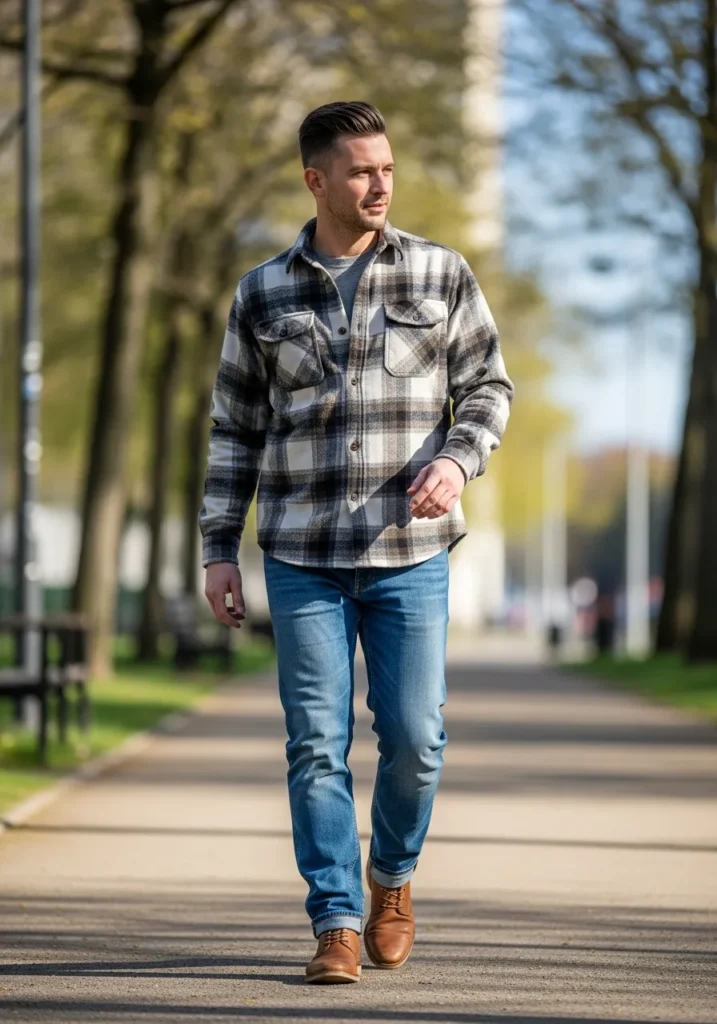 This outfit pairs a neutral plaid flannel shirt with blue jeans and casual brown shoes. The fit feels relaxed while the pattern adds just enough visual interest to keep things from feeling basic.