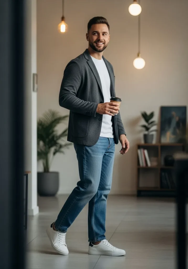 This outfit features a dark casual blazer layered over a simple top with blue jeans and white sneakers. It blends casual comfort with a slightly dressed up feel.