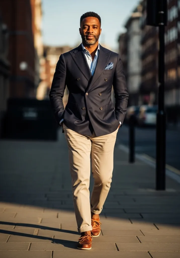 This outfit combines a soft navy blazer with a light blue shirt and khaki pants, creating a relaxed nautical color palette that feels fresh and wearable. The mix of cool blues and warm neutrals keeps the look balanced, and the tailored fit makes it feel sharp without being stiff.