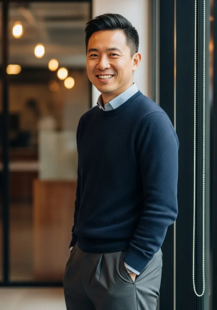 This look features a navy crewneck sweater layered over a crisp shirt and paired with gray tailored trousers. The simple color palette keeps things classic, while the clean fit makes the outfit feel neat and intentional.