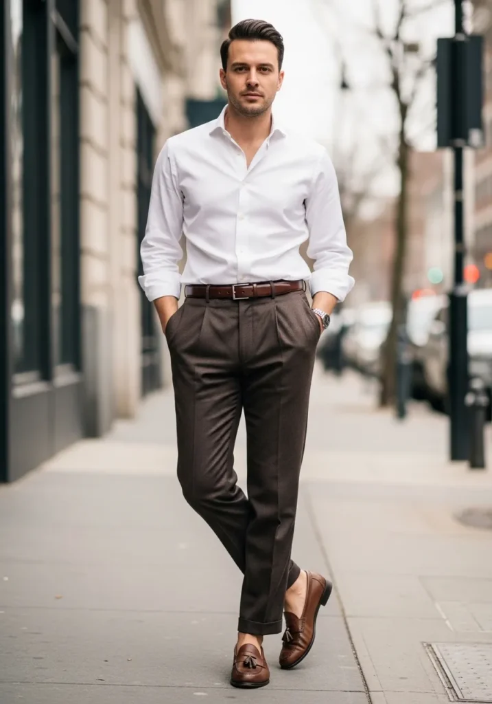 This look is all about clean lines and rich brown tones done right. He is wearing tailored chocolate brown trousers with subtle pleats and a slightly tapered leg, finished with a classic brown leather belt. The crisp white button down is neatly tucked in with the sleeves casually rolled up, adding just enough ease. Brown tassel loafers pull everything together and keep the palette warm and cohesive. The overall vibe feels polished, grown up, and very city ready.