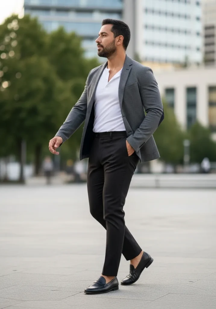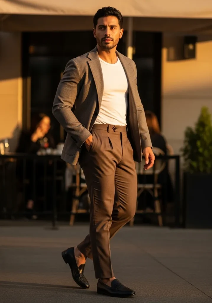 This outfit strikes that perfect balance between dressed up and effortlessly cool. He is wearing tailored mid brown trousers with soft pleats and a slightly cropped hem that shows a bit of ankle. The fabric drapes cleanly and gives a refined shape through the leg. On top, a simple white fitted T shirt keeps the look fresh and minimal, layered under a structured gray blazer that sharpens everything instantly. Black leather loafers add a sleek finish and keep the whole vibe modern and polished.