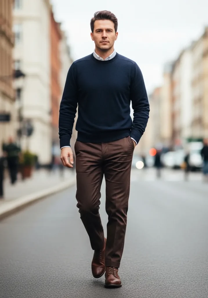 • Navy Sweater with Deep Brown Tailored Trousers