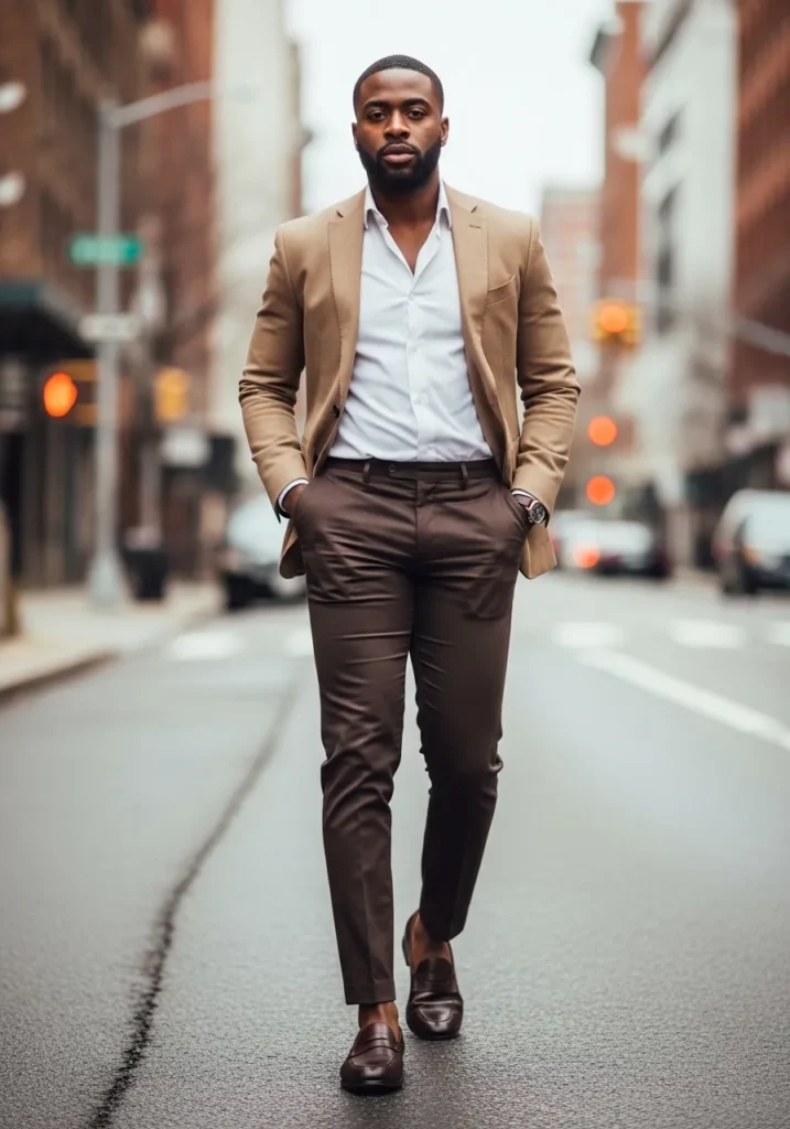 This look feels powerful and perfectly styled for the city. He is wearing dark brown slim fit trousers that taper cleanly down the leg and sit neatly at the waist. The fabric has a slight sheen that gives it a dressier edge. A crisp light button down shirt keeps the base fresh and sharp, while a tailored tan blazer adds warmth and structure. Dark brown leather loafers complete the outfit and create a smooth, cohesive finish from top to bottom.