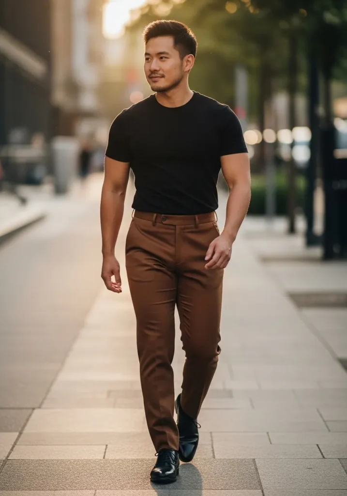 • Fitted Black Tee with Streamlined Brown Trousers