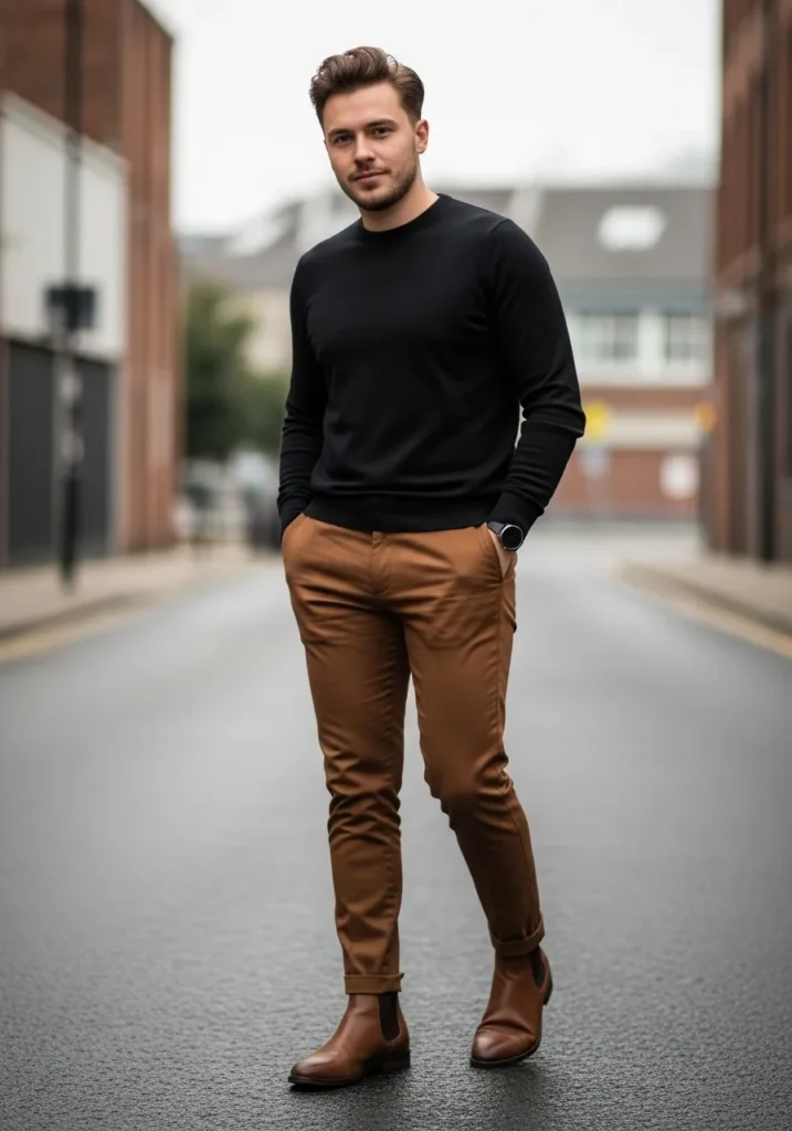 This outfit is clean, sharp, and a little bit bold in the best way. He is wearing slim brown trousers with a slightly cropped hem that shows off the ankle and gives the look a modern twist. The fabric looks smooth with a tailored structure that keeps the leg line sleek. On top, a fitted black crewneck sweater creates a strong contrast and keeps the silhouette streamlined. Brown leather Chelsea boots echo the warm tone of the trousers and add a polished finish.
