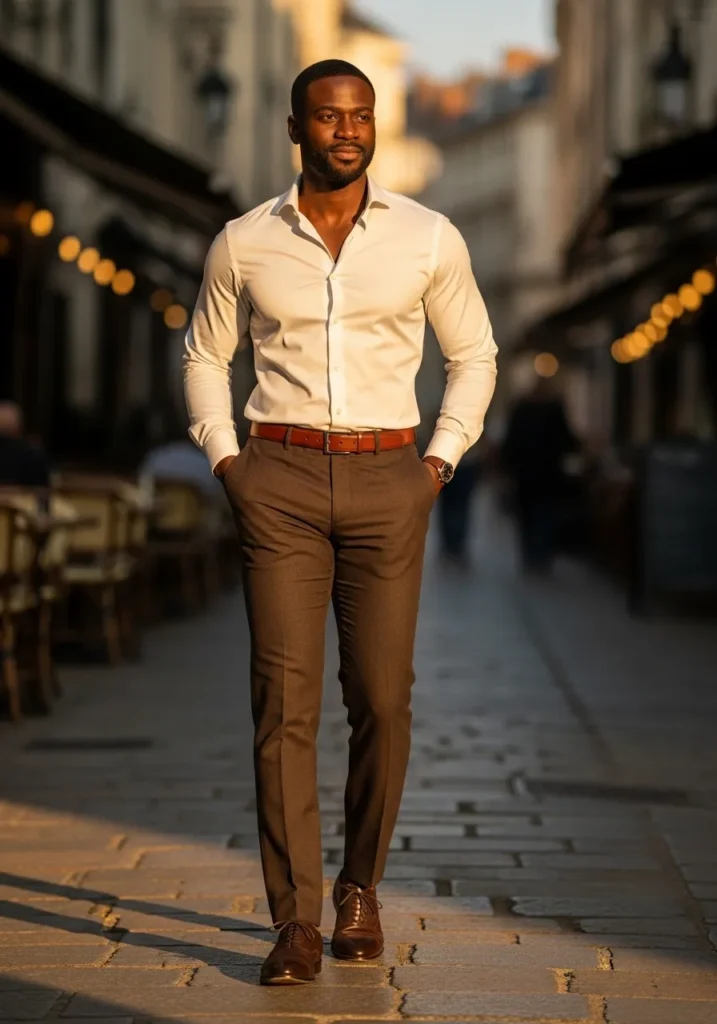 I love this outfit because it looks so intentional without trying too hard. The contrast between the sharp white shirt and deep brown trousers feels fresh and confident. Rolling the sleeves softens the formality and makes it more approachable, which I always find attractive. It is simple, balanced, and incredibly flattering. If a man showed up dressed like this, I would immediately think he has great taste and knows exactly what he is doing.