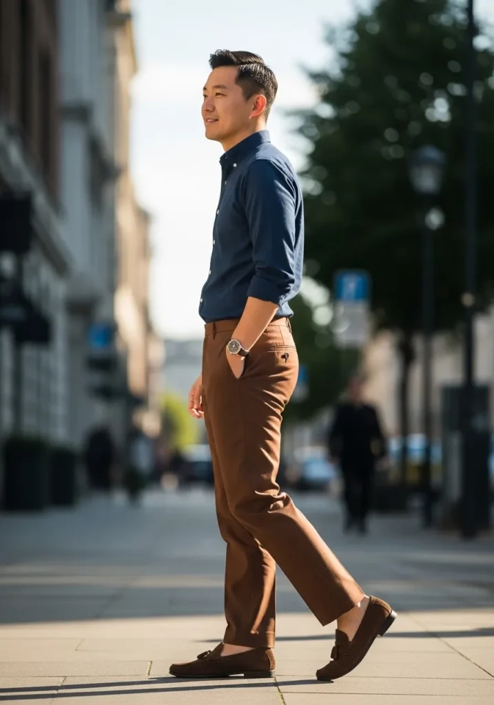 This outfit feels crisp, relaxed, and very thoughtfully styled. He is wearing tailored brown trousers with a clean slim cut and a slightly cropped hem that shows a bit of ankle. The fabric looks smooth and structured, keeping the silhouette sharp from waist to ankle. On top, a fitted navy button down shirt adds depth and contrast without overpowering the warm tone of the pants. Brown suede loafers complete the look and tie everything together in a seamless way.