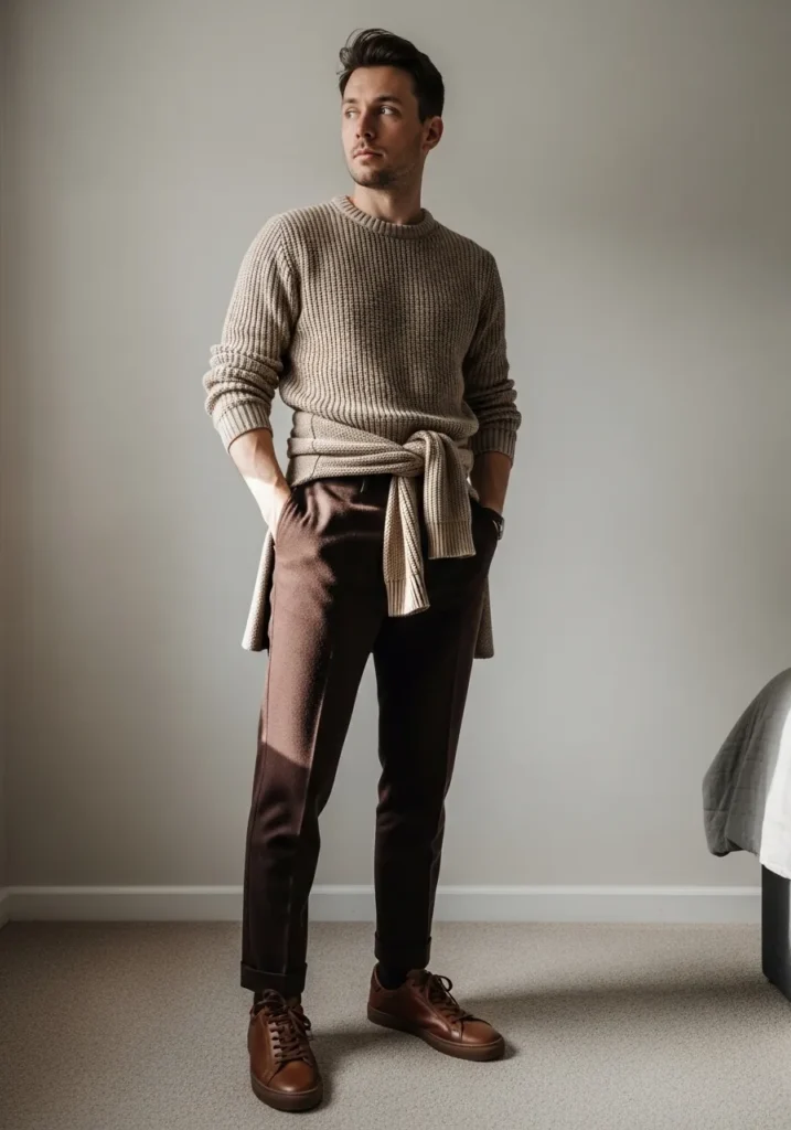 This look feels cozy but still very put together. He is wearing dark brown tailored trousers with a slim fit and a neat cuff at the hem, which adds a subtle touch of personality. The fabric looks structured and smooth, keeping the silhouette clean through the leg. On top, a textured beige knit sweater brings warmth and depth, and the extra sweater casually tied around his waist adds an effortless layered detail. Brown leather sneakers complete the outfit and keep it relaxed yet polished.