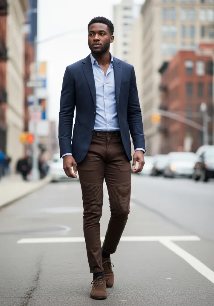 This outfit is giving modern city confidence in the best way. He is wearing slim fitted dark brown trousers with subtle panel detailing at the knees and a clean tapered leg. The fabric has a smooth finish that hugs the frame without looking tight. On top, a light blue button down keeps things fresh and sharp, layered under a tailored navy blazer that adds structure. Brown suede lace up shoes tie back to the trousers and keep the whole look cohesive and grounded.