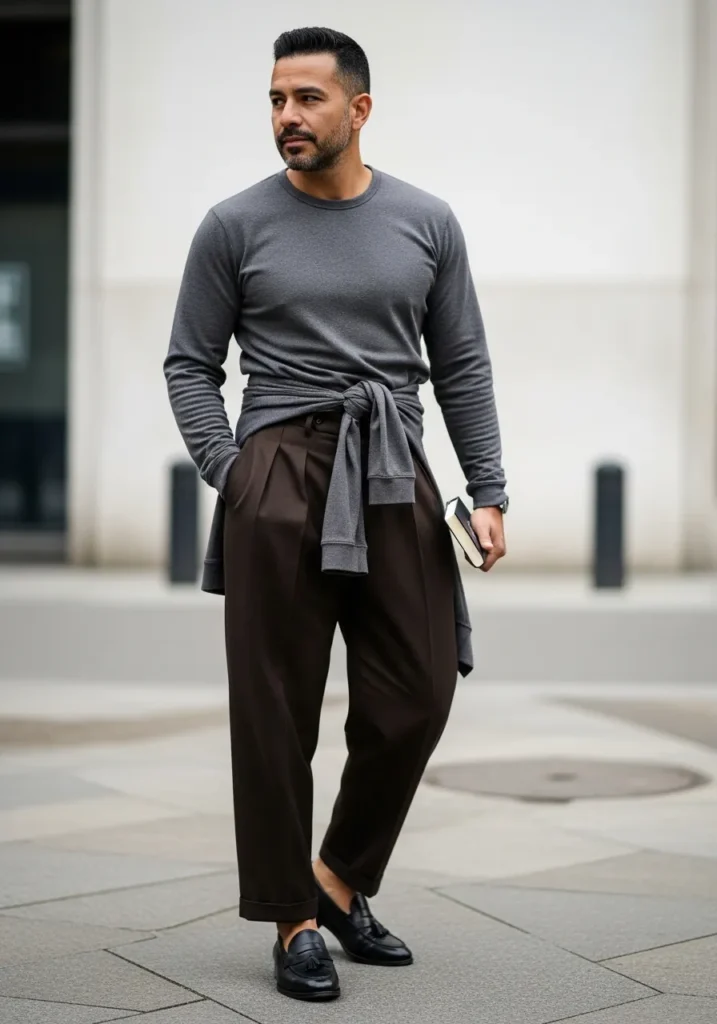 This outfit feels elevated and a little fashion forward in the best way. He is wearing deep brown trousers with a wider leg and soft pleats that give the fabric movement and structure. The hem is slightly cropped and cuffed, which keeps the silhouette modern and intentional. On top, a fitted charcoal long sleeve knit keeps things streamlined, and the extra sweater casually tied at the waist adds a relaxed layered detail. Black leather tassel loafers finish the look with a polished touch.