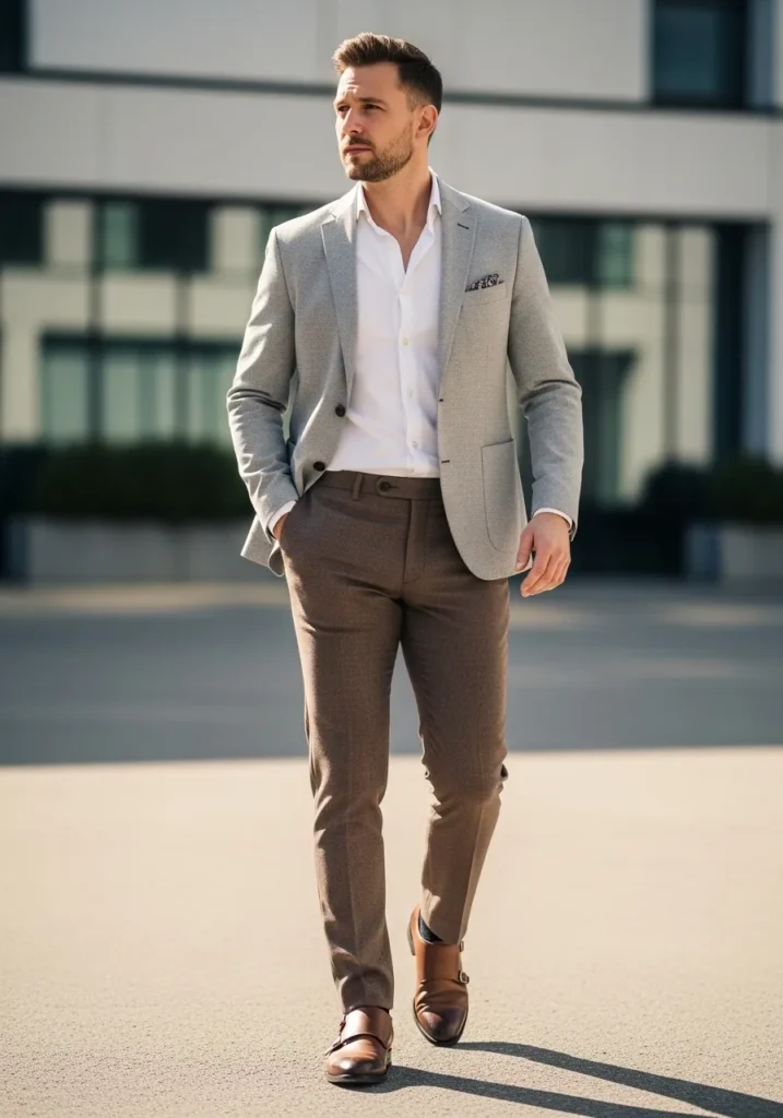 This look feels sharp, refined, and perfectly balanced. He is wearing slim tailored brown trousers with a clean line and a smooth finish that keeps everything looking structured. The fit is close but comfortable, giving a polished silhouette from waist to ankle. On top, a crisp white button down brightens the outfit and keeps it classic. The light gray blazer adds contrast and a touch of sophistication, while brown leather double monk strap shoes tie the whole look together in a cohesive way.