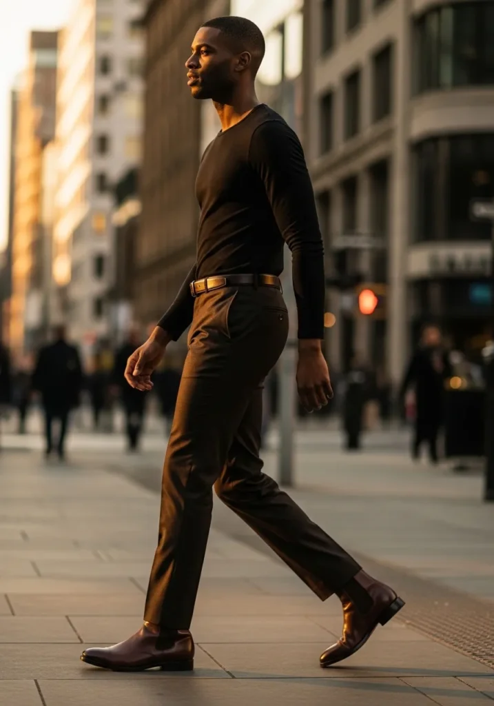 This outfit is clean, sharp, and quietly powerful. He is wearing slim brown trousers with a smooth tailored fit that follows the leg without looking tight. The fabric has a subtle sheen that catches the light beautifully. On top, a fitted black long sleeve shirt keeps the look streamlined and modern. A classic brown leather belt adds a warm accent at the waist, and dark brown leather Chelsea boots complete the outfit with a polished finish.