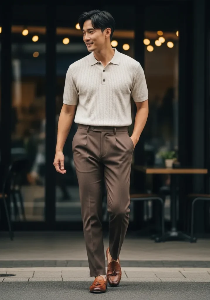 This outfit feels relaxed but still very put together. He is wearing tailored brown trousers with a clean slim fit and subtle pleats that give a bit of structure at the waist. The fabric looks smooth and lightweight, perfect for warmer days. On top, a beige ribbed knit polo adds texture and softness, with short sleeves that keep it casual and easy. The warm brown leather tassel loafers echo the tones of the pants and bring everything together in a polished way.