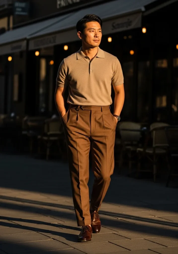 This look leans into rich warm tones and it feels so refined. He is wearing high waisted brown pleated trousers with a softly tapered leg and a clean cuff at the hem. The fabric drapes beautifully and gives that tailored but relaxed feel. On top, a fitted taupe knit polo keeps the palette cohesive and smooth. Dark brown leather lace up shoes finish the outfit and add a subtle shine that elevates the whole look. The golden hour lighting makes the browns glow and adds to that polished evening energy.