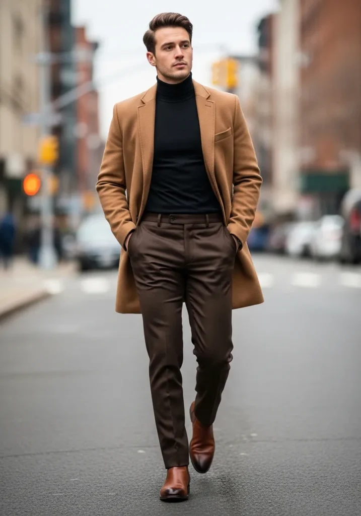 • Camel Coat and Black Turtleneck with Sleek Brown Trousers