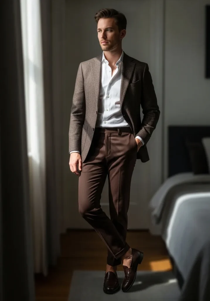This look feels refined and quietly confident. He is wearing deep brown tailored trousers with a clean slim fit and subtle structure through the leg. The fabric looks smooth with a slight sheen that catches the light beautifully. On top, a crisp white button down keeps things classic and sharp. The textured brown blazer adds depth and dimension, making the outfit feel layered and intentional. Dark brown leather loafers finish everything off with a polished touch that ties back to the trousers.